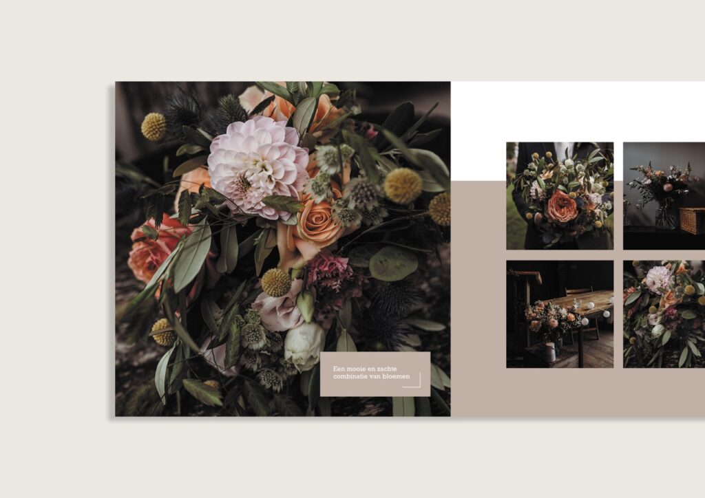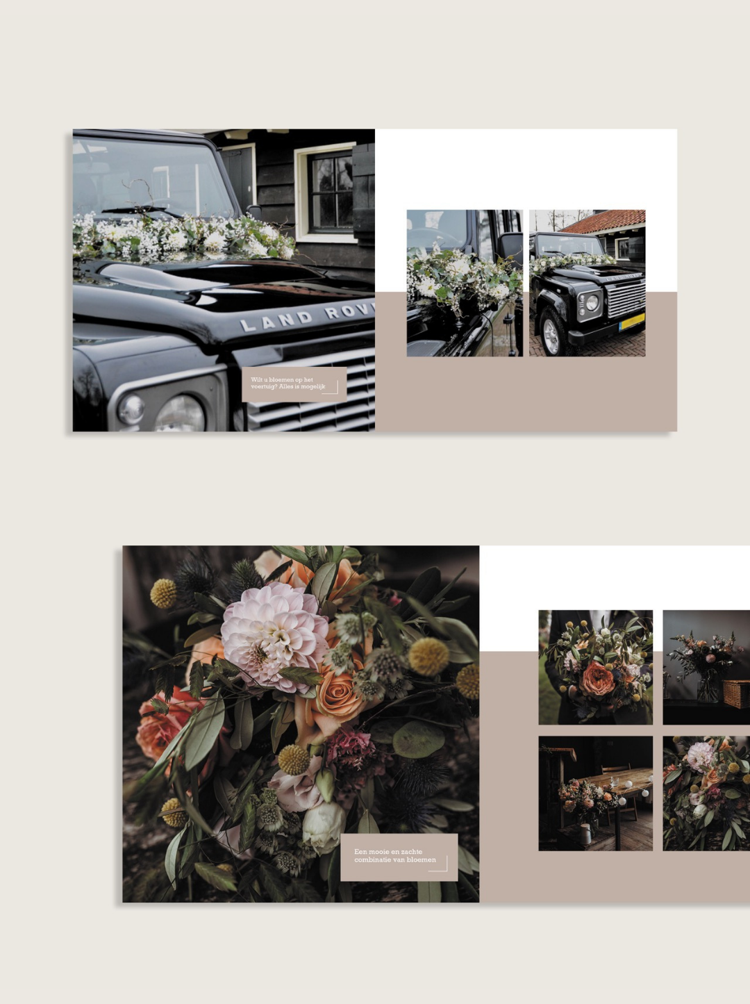 Bloem Harmelen zorgt voor de meest prachtige bloemstukken. Aan mij de taak om een lookbook vorm te geven dat toekomstige bruidsparen een sfeerimpressie geeft van wat Bloem Harmelen allemaal in huis heeft. Door het gebruik van de zachte kleur krijgt het boek gelijk een romantisch gevoel vanaf de eerste pagina.